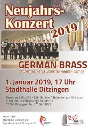 Für das Ditzinger Neujahrskonzert am 1. Januar 2019 hat GERMAN BRASS Werke von Bach, Verdi, Strauß, Gershwin, Bernstein und anderen großen Komponisten im Gepäck. Ein MUSS für alle Freunde des Blechbläser-Sounds - und solche, die es nach diesem Konzert sicherlich geworden sind. Freuen Sie sich auf einen spektakulären Abend mit fulminantem Klangerlebnis!