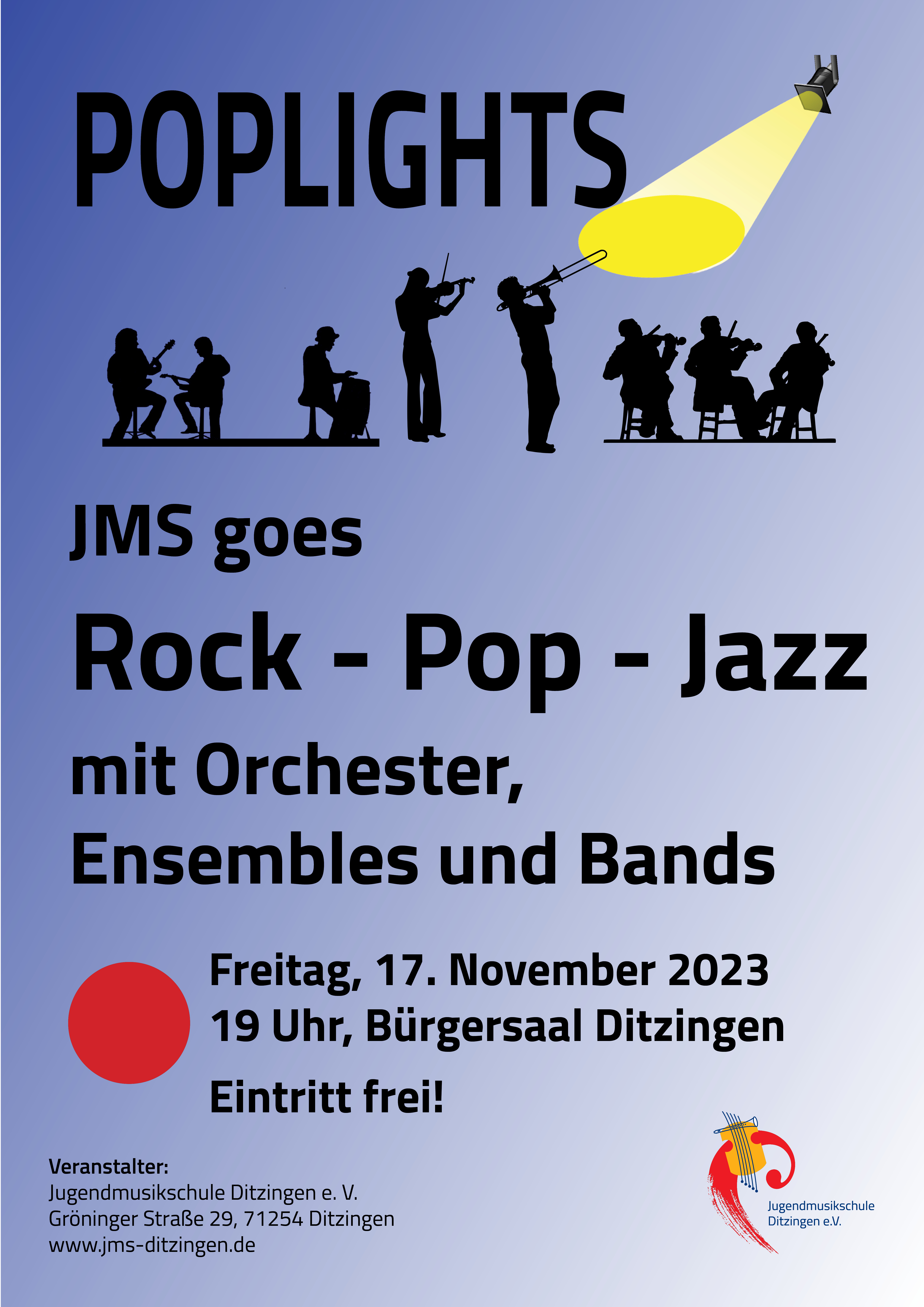 Das „Highlights-Konzert“ hat einen festen Platz im Veranstaltungskalender der JMS Ditzingen. Dass die Jugendmusikschule nicht nur „klassisch“ kann, zeigen die Schülerinnen und Schüler beim „Poplights“-Konzert, das erstmals am Freitag, 17. November 2023 um 19.00 Uhr im Bürgersaal in Ditzingen stattfindet. Neben unseren Bands „Motown Heroes“, „Crazy smileys“ und „Rockfox“ präsentieren sich auch Ensembles wie das Streichorchester und weitere Formationen, die sich auf das Abenteuer Rock, Pop, Jazz einlassen.