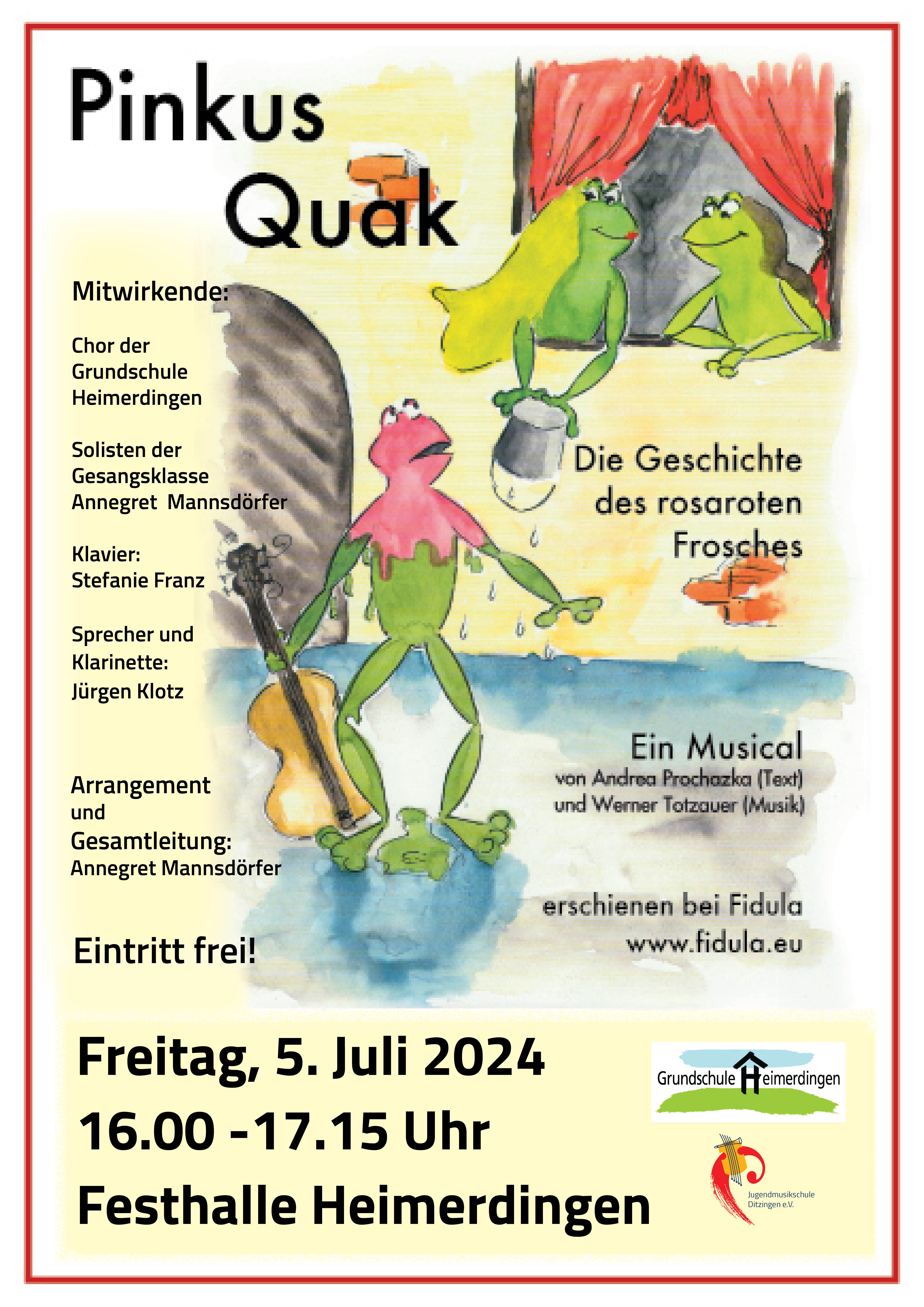 Freuen Sie sich auf das Musical Pinkus Quak mit dem Chor der Grundschule Heimerdingen. Mit dabei sind Solisten der Gesangsklasse der Jugendmusikschule von Annegret Mannsdörfer, Stefanie Franz am Klavier und als Sprecher und mit der Klarinette Jürgen Klotz. Der Eintritt ist frei!